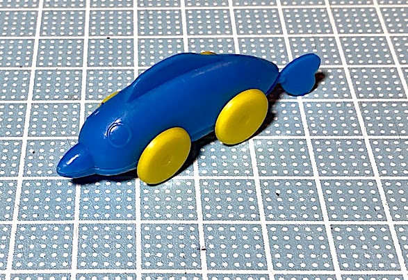 私がこのまえ購入した4台(各80円)のプラスチック製くるま玩具はどちらの用途も満たしてない。自走はおろか指で弾いても数センチしか進まない車輪付属の理由は不明である。そして奇妙なことに品名は〈いぬのくるま〉〈いたちのくるま〉〈いかのくるま〉〈いるかのくるま〉と全て「い」から始まるのだった。