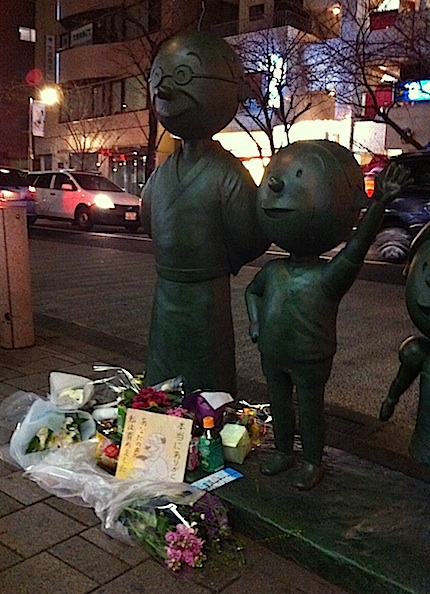 地元の桜新町駅前。永井一郎さん急逝で波平像に供物の山…。