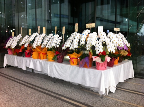 読売新社屋ロビー。大企業の社長から届いた胡蝶蘭の一部です。
