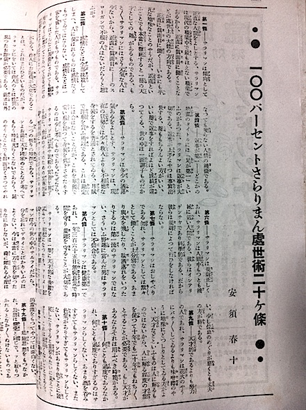 …さて。目次の中で、気になった見出しが2つありました。『100パーセントさらりまん処世術二十ヶ条』と『美術経済学』です。今日における『さらりまん』の皆さんに向けて、ためになりそうな処世術を拾い読みしたいと思います。
