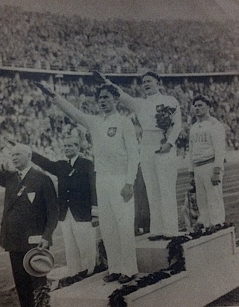 砲丸投げで金銀獲得したドイツ選手。植木鉢を片手にHeil!の敬礼。