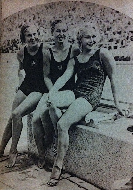 女子飛込の選手。胸にハーケンクロイツ水着のドイツ選手とアメリカ選手2名。