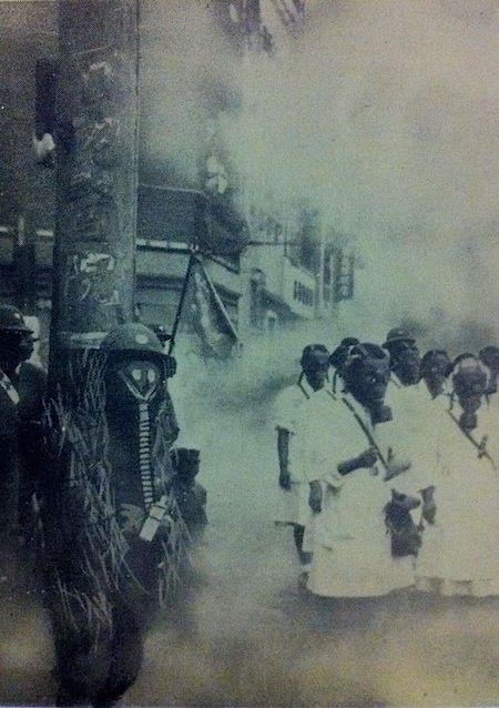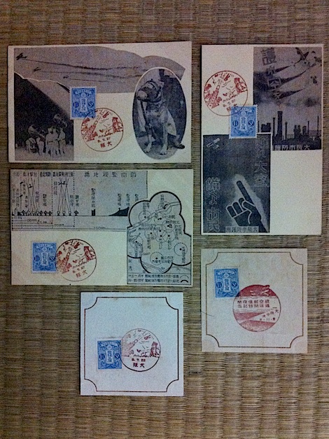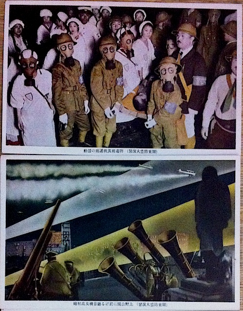 わたしは怒りに任せて大量の「防空」資料を買い漁った!…防空という言葉が世を跋扈しはじめたのは、関東軍が満州で軍事活動をはじめ張作霖事件などをおこした昭和3年ころ。大阪の防空演習を皮切りに昭和8年には「関東防空大演習」という防空大イベントが催され、色々なバリエーションの絵葉書セットが発売されました。このように昭和3年から太平洋戦争末期にわたる15年以上のあいだ様々な出版物で啓蒙されつづけたので、いざ「防空関係」の資料を集めよう!と意気込めば入手は容易です。初期のガスマスク着用スタイルから更生服(着物から防空服へとリメイク)と防空頭巾へと至る変遷もかんたんに辿れます。っていうか、ガスマスクや防空頭巾の虜になってしまった。セーラー服+ガスマスクのスタイリングの毒々しさ…。憎しみを凌駕して最早LOVE !!!