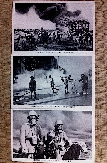 化学戦の話に移るまえに、今日は昭和8年(1933年)8月9日〜11日開催の「関東防空大演習」とそのほかの都市で開催された「防空演習」の記念絵葉書を紹介します。