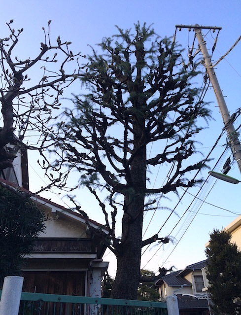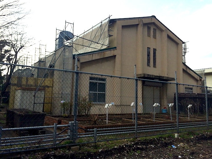 今回の散歩ですごい発見がありました。本当に収穫です!ウチから一番近い戦争遺跡「陸軍衛生材料本厰」という陸軍施設の跡が上用賀にあります。この施設が置かれた1934年当時のものと思われるモルタルの塀などが残っていてなかなか良い感じなのです。経堂に向かう道すがら、通りかかった時、見たことのない近代建築が目に飛び込んできました。旧敷地内に建てられた民家の一軒が取り壊されて自衛隊駐屯地の一部が丸見え状態になり、その「研究棟」とおぼしき建築が通りに出現したわけです。「衛生材料厰」の跡地は戦後GHQから返還された後、国立衛生試験場となり今は国立医薬品食品総合研究所と名称を変えて使用され、同じ敷地に隣接する形で陸上自衛隊用賀駐屯地と駒沢大学付属高校があります。この謎の研究棟は駐屯地の南側の敷地内に建っていました。