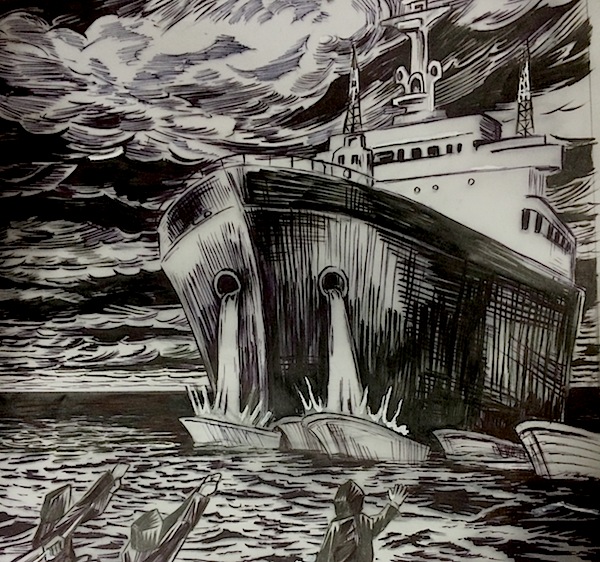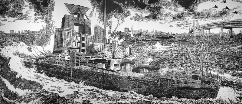 これは96年開催予定だった世界都市博の頓挫の残骸、お台場のパビリオン建築群が、戦艦大和のような姿で東京湾を漂流している図。臨海再開発地区の象徴、バブリー構築物は、走り出したら止まらないハコモノ行政と大鑑巨砲主義の亡霊に憑衣されたまま現在も東京湾を漂泊中!