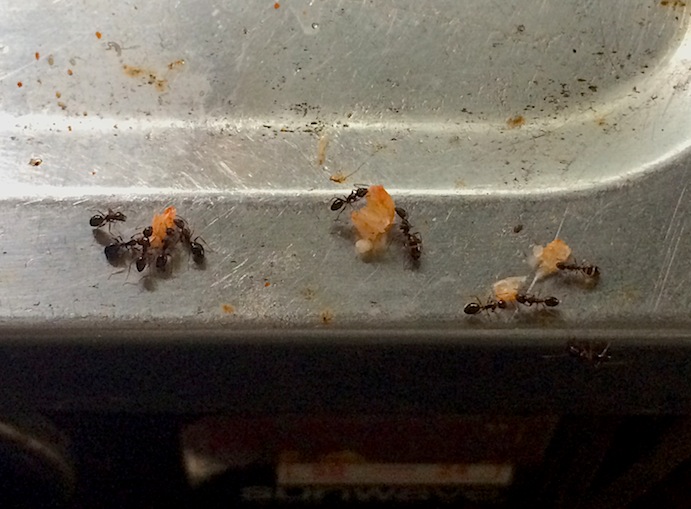 こちらはリアル蟻。調理中に落ちた桜エビを砕いてやったら、あっという間に運び去っていった。
