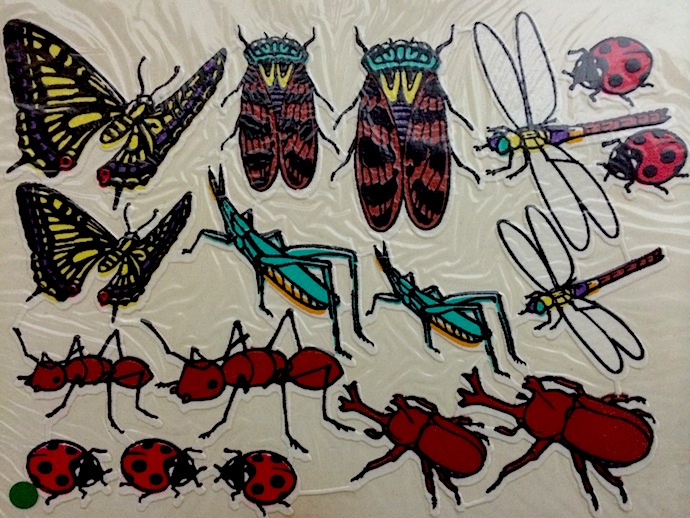 「お気に入りのクラッチバッグにショウリョウバッタ(オス)を貼ろうかしら?」とバッタシールをめくった途端、隣のメスバッタ、アリ、セミ、カブトムシ、トンボ….と望まぬ剥離が次々連鎖する一網打尽構造!(触角、足、羽根の先から伸びた細いランナーで結合してる)