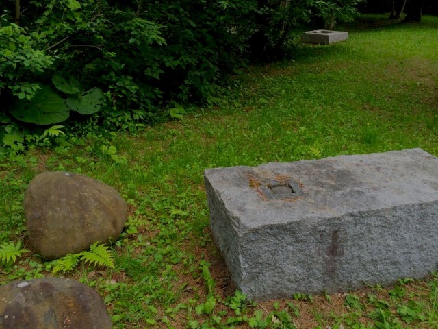 この石の彫刻は「共存」という名前で「はめ込まれた丸石シリーズ」の一部です。丸い岩にも棺のような四角い岩にも、小さな丸石がはめ込まれてますが、四角い岩にはめられた饅頭のような石は、いつも微妙に飛び出しています(写真は私がはめ直した後)。それはたぶん「森の学校」に参加した学童の仕業と推測されます。
