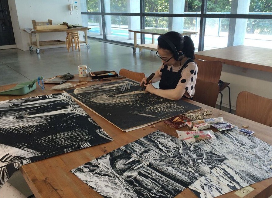 こんなに雨で憂鬱になるとは思っても見なかった!侘しさ100%で気分はブルー。最高気温13度と冬並みの寒さ(ペラペラの長袖2枚しか所持せず)サンダル履きで足下が悪いので散歩もままならず、おのずと創作棟に幽閉状態です。「景気付けに酒でも飲もう!」と手酌のワインたった一杯で酔っぱらい(普段はこんなに弱くない)いつもの酒癖が出て所構わずの歌謡ショー。だだっ広い夜の作業室にこだまするはシューベルトのセレナーデ。「いで来よ君」と歌っても誰も来るはずがない。酔ったいきおいで版木を彫ってる近眼女がただ一人です。