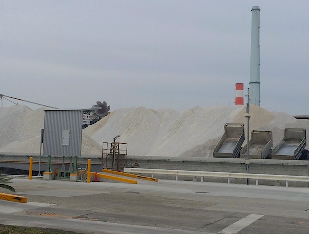 大型ダンプの出入りする危険な道路に迷い込むとそこに石灰の築山が