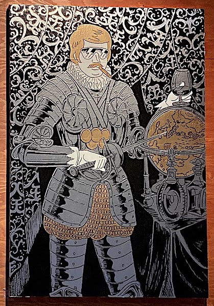 襞襟をあしらった西洋甲冑にティアドロップ、70年代風のヘアスタイルがイカしたこの貴族は〈Baron von BOTTE〉一突男爵その人である。彼は貢ぎ物のレミーマルタン・ルイ13世をバカラのグラスに注ぎ、獲物ジパングに剣を突き刺し黄金の獲得に野心を燃やす。その金の夢は天鵞絨のカーテンに綴られたアラベスクに浮かび上がっている(わかるかな?)