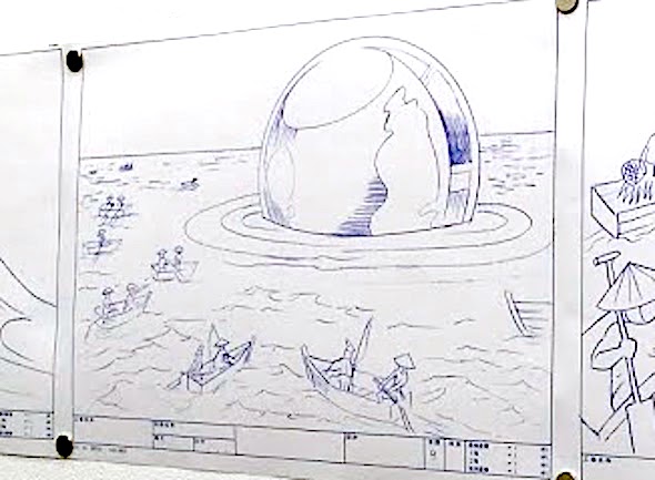 未知の物体に熱狂する船頭と漁師と釣り人。夢中になって素手や櫂での運搬に挑戦する男達と、それを静観する男が数名。球体の行方は如何に?(続きは海上ではなく会場で)