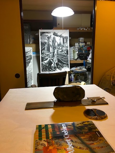 版木上には和紙/自作見当板と水石とスプーン/自作バレン/画集が置かれている。水石とアルベルトオーレン画集は文鎮代わりで、途中で紙がズレないように押さえる役割を担っている。この観賞石はすごく重たくて役に立ったが、酷使し疲労蓄積した手で扱うのに危険が伴った(指を挟んだり足に落下させる恐れが)。ご覧の通り、私は27年前に作った手作りバレンとスプーンだけで全作品を一人で刷っているのだ!(6m以上あるディスリンピックも)。
