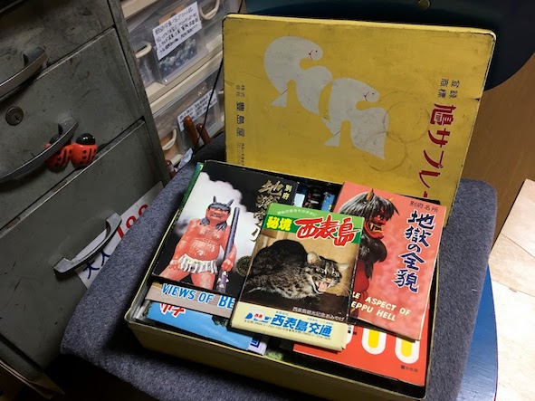 『ガソリンで見た夢』原画のスーパー林道絵葉書も資料として展示しようと蓋を開けたら毒々しい絵葉書集、地獄めぐり/秘境!西表島/地獄の全貌が…これらを全部開封し捜索するのはまさに地獄。