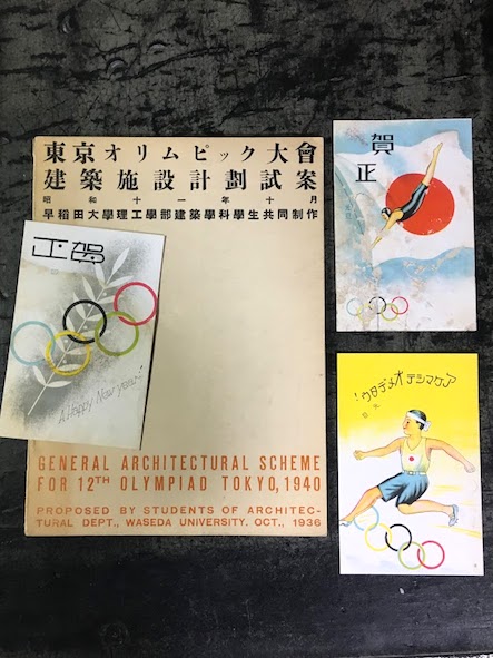 五輪年賀状とオリンピック会場建設のコンペ資料(早大理工学部の競技場デザインはインターナショナル様式風でオシャレ)